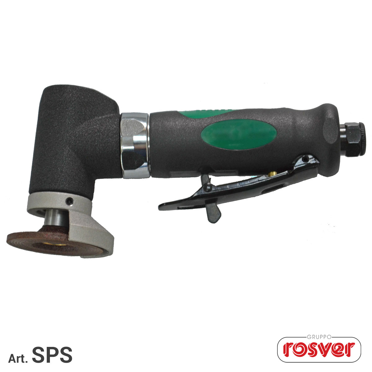 Mini smerigliatrice ad aria 97°, scarico silenzioso. Sistema di avviamento con leva di sicurezza.