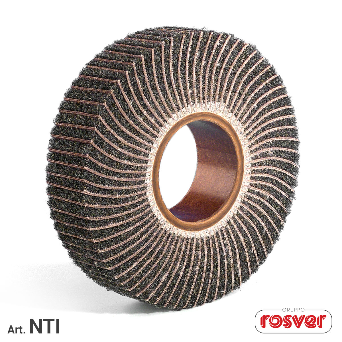 Ruote lamellari miste con foro composte da lamelle di tela abrasiva alternate a lamelle di non tessuto e montate attorno ad un nucleo di fibra.